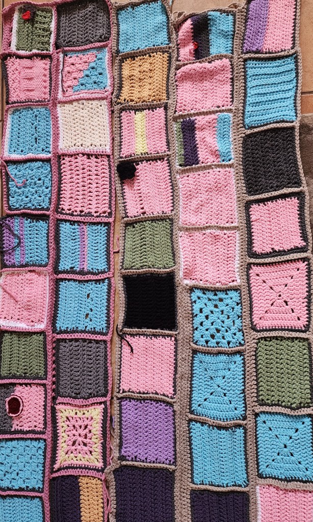 Twee toetsblokkies skop die kombers af en dan vertel die rye, bestaande uit 14 blokkies elk (dus 2 weke) ‘n kleurvolle storie van hoe ek op ‘n spesifieke tyd gevoel het. Ek besef hoe ek met hierdie hekel-kombers my innerlike gevoelsruimte oopmaak vir baie om te aanskou. En so word my 2023 voel-voel hekelprojek nΓ³g meer kompleks en veelseggend.